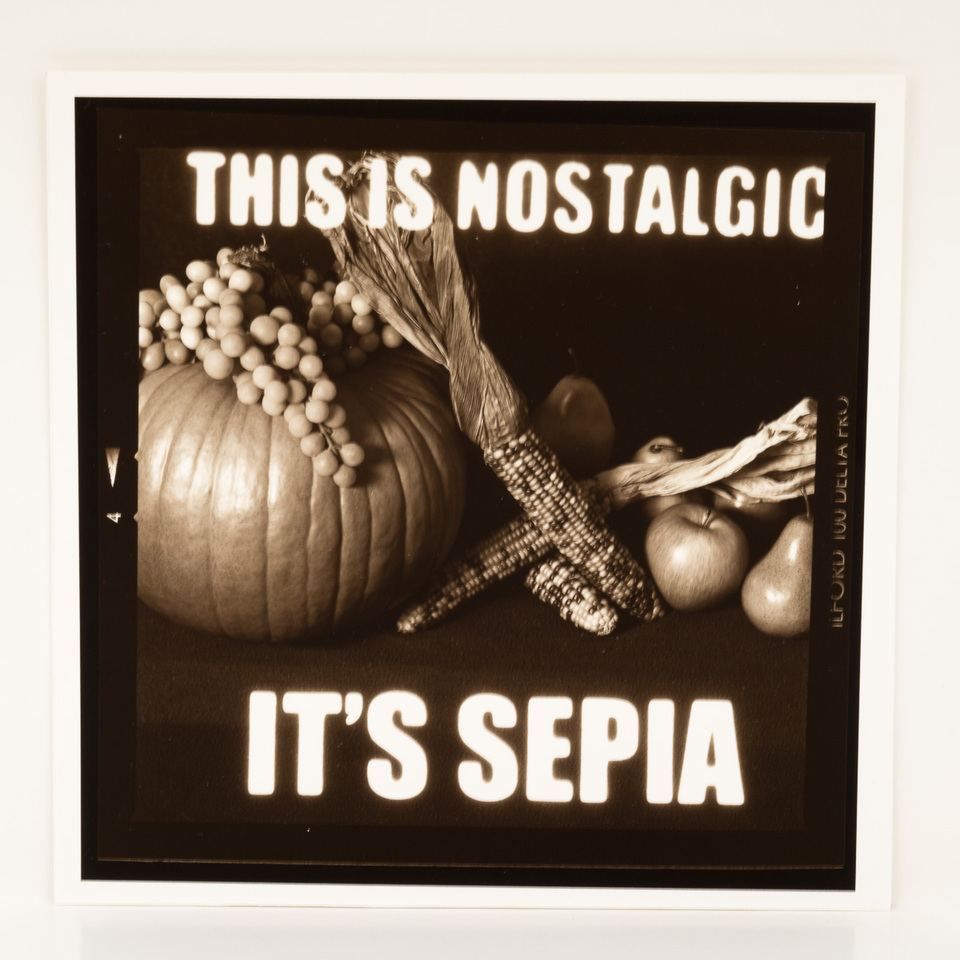“Digital-style” means first creating an inkjet printed transparency of the text, then contact printing that onto lith (graphic arts) film to make a mask. I then take the mask and put it in the camera between the lens and the film plane, expose light through it, and then remove the mask before making the final exposure of the scene. This is why I call this work “In Camera” — everything you see in the image was created inside the camera box (with a few exceptions, like the toning color and the lith development).